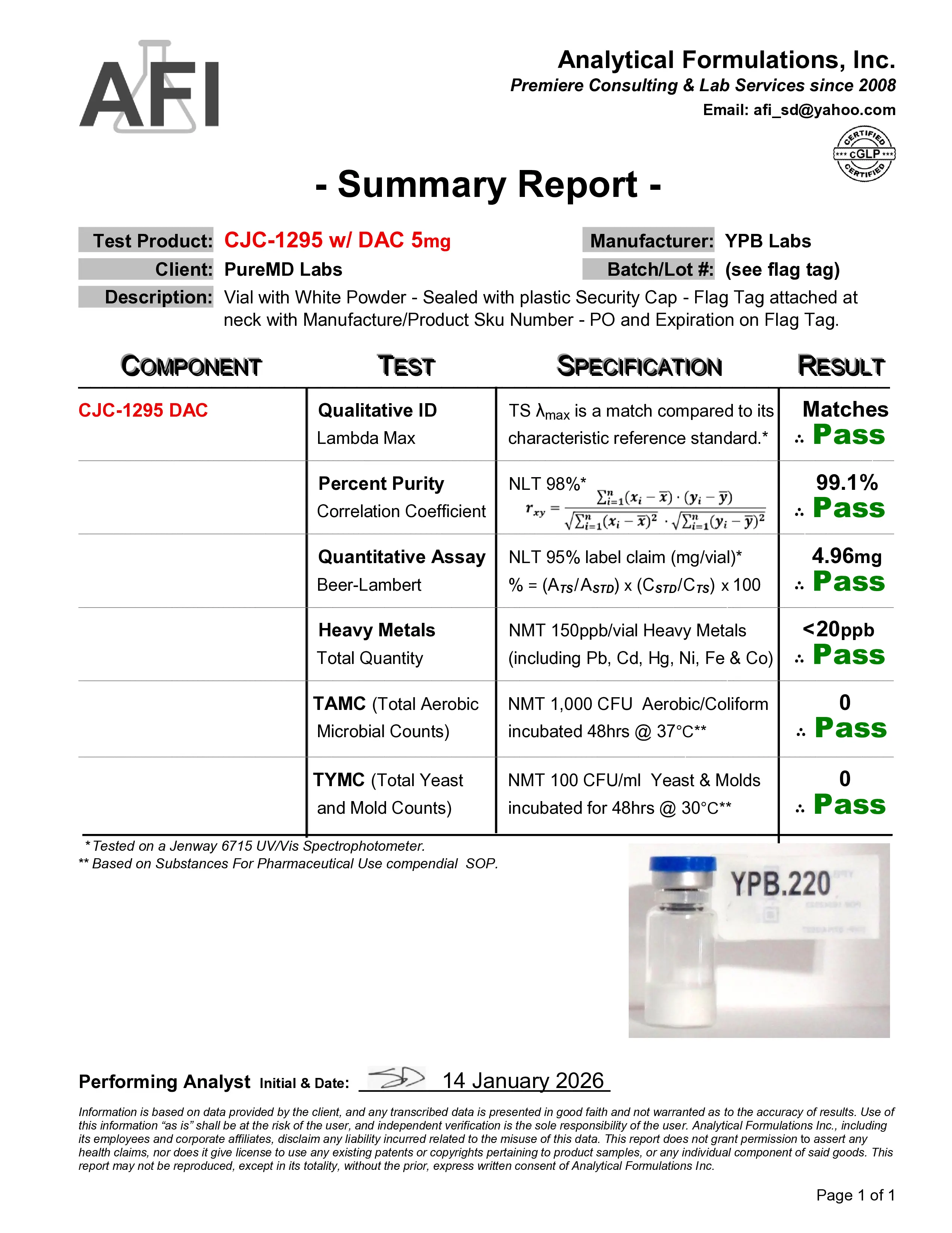 Peptide.co’s CJC-1295 With DAC has been verified at 99.5% purity through independent third-party HPLC testing. The current batch (Lot #YPB.220, 5mg) includes a full Certificate of Analysis confirming identity, purity, and peptide content. All COAs are publicly available at coa.peptide.co. Testing covers HPLC purity analysis, mass spectrometry identity confirmation, heavy metals screening (<20 ppb), and microbial limits (TAMC/TYMC: 0 CFU). All products are manufactured in FDA-registered facilities in the United States.
