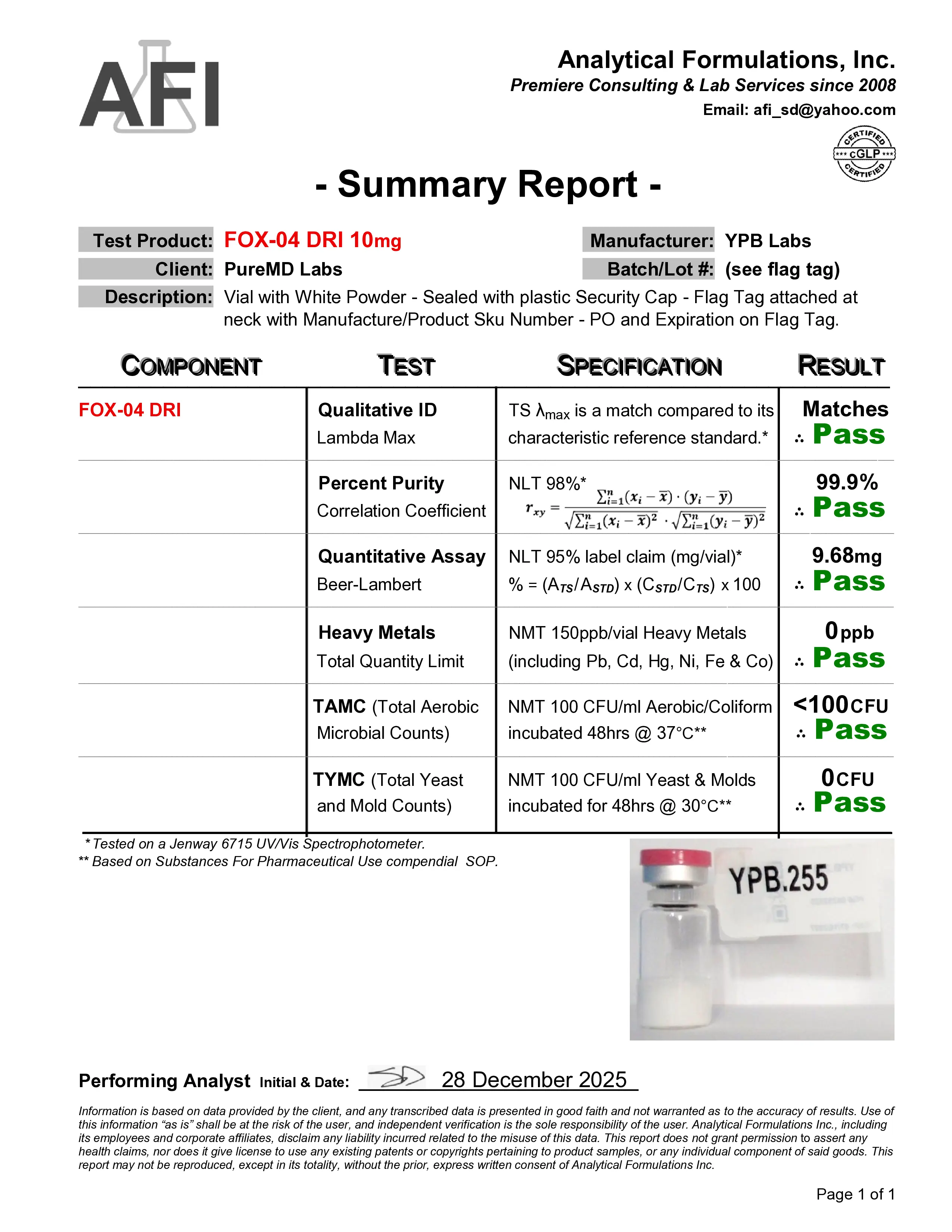 Peptide.co’s FOXO4 has been verified at 98.9% purity through independent third-party HPLC testing. The current batch (Lot #YPB.255, 10mg) includes a full Certificate of Analysis confirming identity, purity, and peptide content. All COAs are publicly available at coa.peptide.co. Testing covers HPLC purity analysis, mass spectrometry identity confirmation, heavy metals screening (<20 ppb), and microbial limits (TAMC/TYMC: 0 CFU). All products are manufactured in FDA-registered facilities in the United States.