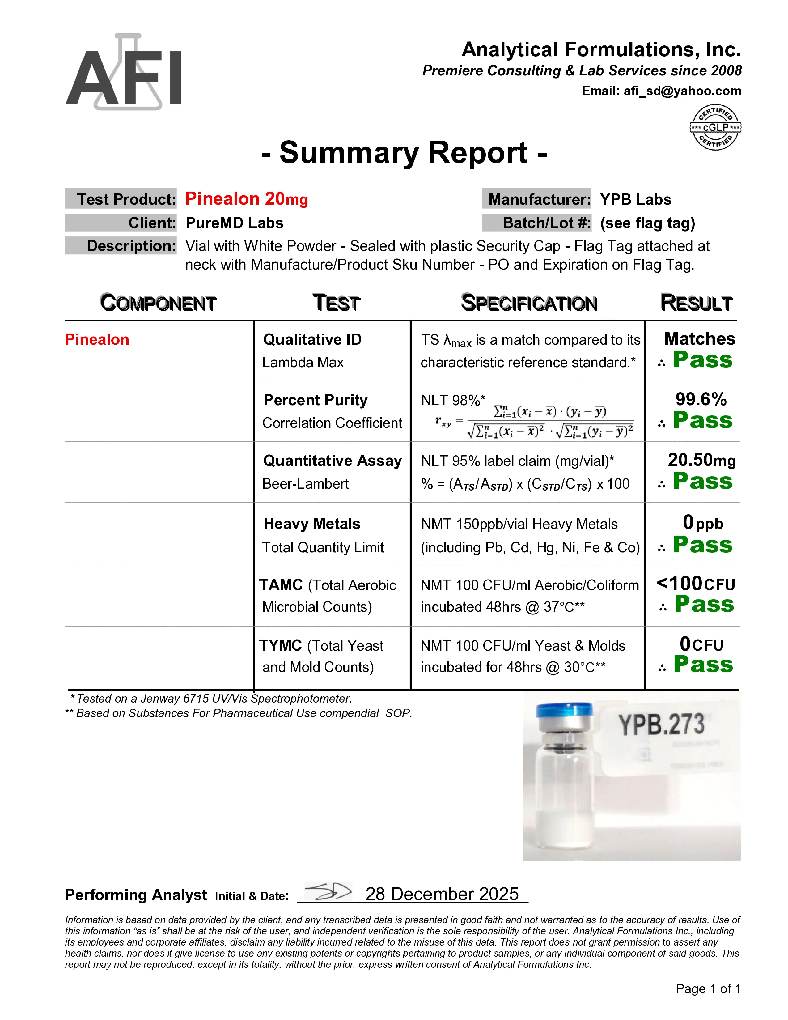 Peptide.co’s Pinealon has been verified at 99.5% purity through independent third-party HPLC testing. The current batch (Lot #YPB.273, 20mg) includes a full Certificate of Analysis confirming identity, purity, and peptide content. All COAs are publicly available at coa.peptide.co. Testing covers HPLC purity analysis, mass spectrometry identity confirmation, heavy metals screening (<20 ppb), and microbial limits (TAMC/TYMC: 0 CFU). All products are manufactured in FDA-registered facilities in the United States.