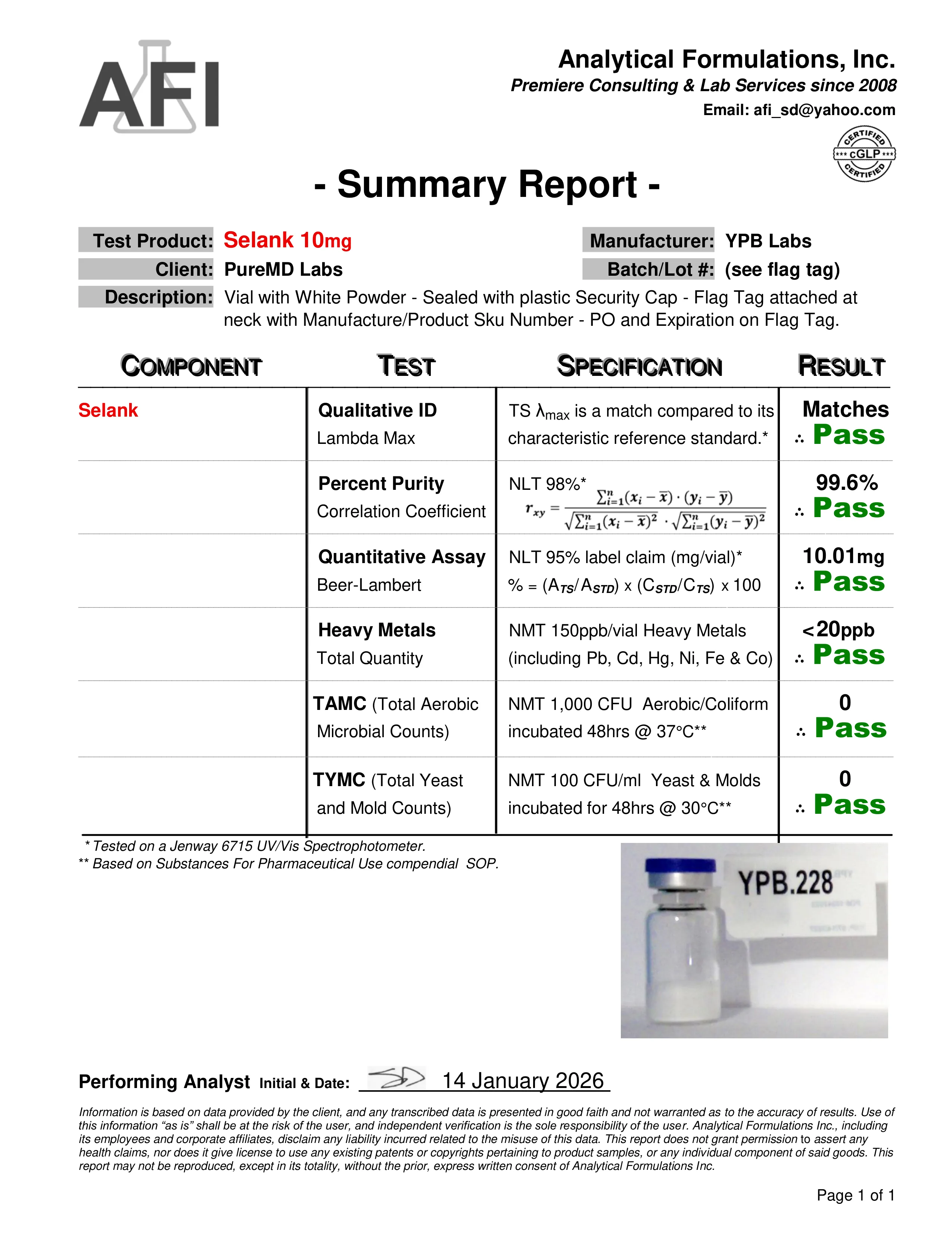 Peptide.co’s Selank has been verified at 99.5% purity through independent third-party HPLC testing. The current batch (Lot #YPB.228, 10mg) includes a full Certificate of Analysis confirming identity, purity, and peptide content. All COAs are publicly available at coa.peptide.co. Testing covers HPLC purity analysis, mass spectrometry identity confirmation, heavy metals screening (<20 ppb), and microbial limits (TAMC/TYMC: 0 CFU). All products are manufactured in FDA-registered facilities in the United States.