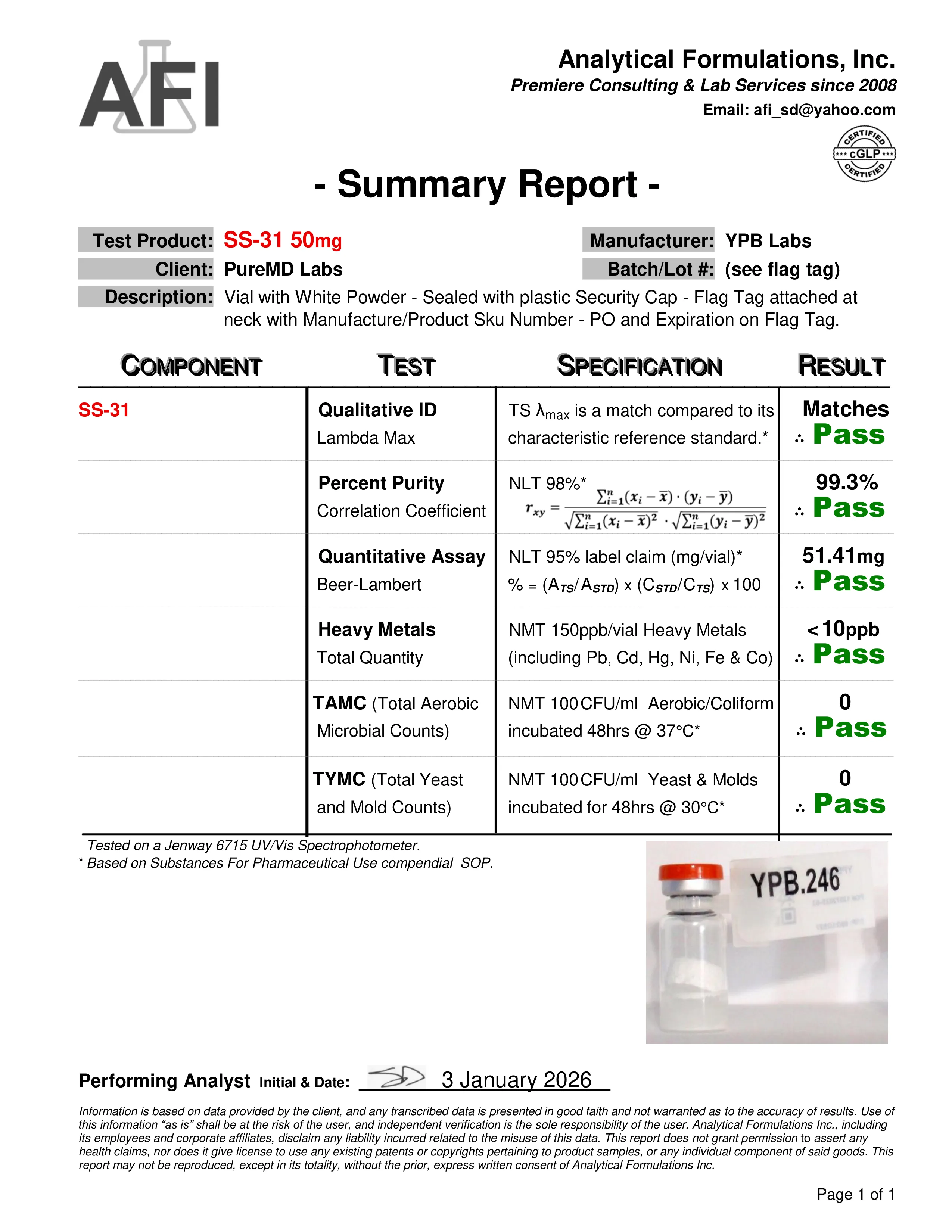 Every batch of SS-31 from Peptide.co undergoes independent third-party HPLC testing. Current verified batches: 10mg batch (Lot #YPB.245): 99.1% purity; 50mg batch (Lot #YPB.246): 99.3% purity. Full Certificates of Analysis are publicly available at coa.peptide.co, covering HPLC purity, mass spectrometry identity confirmation, heavy metals screening (<20 ppb), and microbial limits (TAMC/TYMC: 0 CFU). All products are manufactured in FDA-registered facilities in the United States.